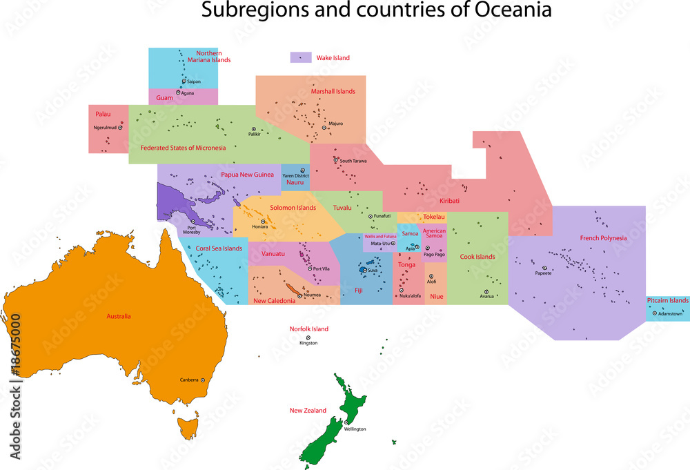 Colorful Oceania Map Countries Capital Cities Stock Vector